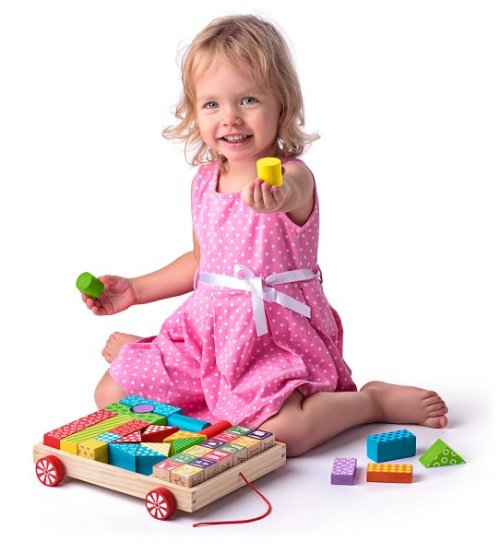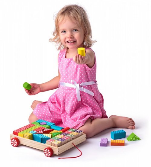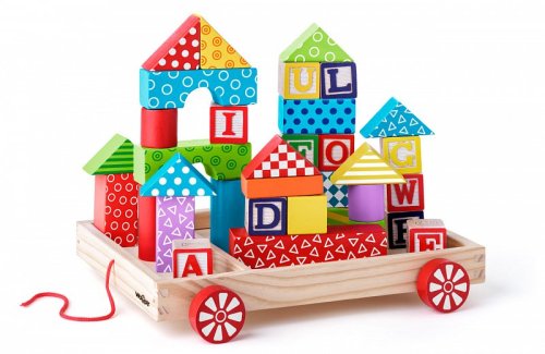 36ti dřevěných kostiček umístěných v dřevěném vozíku. 12 z nich je ze dvou stran barevná a je plasticky provedena tak, aby mohla sloužit po namočení do tiskařského polštářku i jako razítko. Ostatní kostky jsou v barevném provedení s potiskem. | Věk: 3+ | Rozměr: 27 x 24 x 6 cm