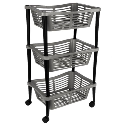 univerzální pojízdný regál s košíky - materiál: kvalitní pevný plast- 3 nad sebou umístěné prostorné košíky pro skladování prakticky čehokoli- vhodné použití v kuchyni, spíži, koupelně, garáži, dílně či na chalupě- snadné přemisťování díky otočným kolečkům- jednoduché a rychlé sestavení- rozměry košíků: 40 x 30 cm- celková výška: 60 cm- barva: šedá / černá