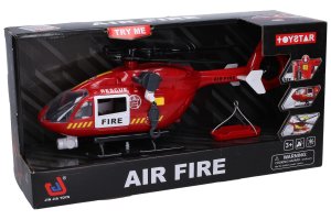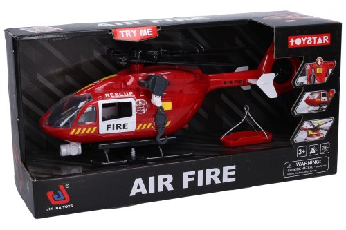 Vrtulník hasičský s efekty. Rozměry 38x12x16 cm. Světelné a zvukové efekty tlačítkem na boční straně vrtulníku. 2xAAA baterie ze spodní strany vrtulníku součástí. Otevírací přední a zadní (nakládací plocha) dveře. Vysunovací lano s hákem pomocí otočné páčky. Součástí lehátko na hák. Funkce na obrázcích na obalu.