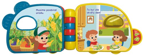 Čtěte nebo poslouchejte příběh o tom, co se také děje U nás na farmě Robustní držátka usnadňují dětem otáčení a objevování Pět ilustrovaných stránek s příběhem o farmáři a jeho práci Po stisknutí svítícího tlačítka se sluníčkem uslyšíte různé písničky nebo zajímavé a poučné fráze o činnosti na farmě Stisknutím tlačítka pro hudbu se spustí přehrávání až 15 různých známých melodií
