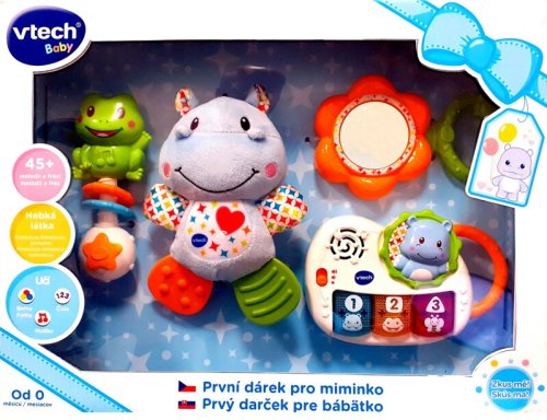 První dárek pro miminko od VTech® je jedinečný soubor hraček pro právě narozené miminko, které mu v prvních měsících jeho života budou přinášet spoustu radosti i poznání. Součástí je: Hrající a zpívající piáno, hebký hrošík, zrcátko, chrastítko žabička 1. Hrající a zpívající piáno. Mluví a zpívá česky. Stisknutím svítících kláves se dítě dozví něco o zvířatech, číslech, barvách, tvarech, uslyší zábavné písničky a melodie. Blikající klávesy stimulují zrakové vnímání. Rukověť piánka je přizpůsobena malým dětským ručičkám podporuje tak i rozvoj jemné motoriky dítěte. 2. Hebký hrošík. Sametově hebký hrošík s nožičkami pro žužlání a kousání. Svým tvarováním a texturami rozvíjí hmatovou stimulaci dítěte. Nohy hrošíka určené ke kousání, masírují i chladí dásně dítěte, a pomáhají nejen ke zklidnění dítěte, ale i od bolestí, které mohou první zoubky způsobovat. 3. Zrcátko. Se snadno uchopitelným držátkem rozvíjí sebepoznávání dítěte. 4. Chrastítko žabička. Třepáním chrastítkem rozvíjí dítě motorické dovednosti i zvukové vnímání.