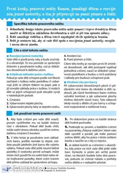 Vybarvování - činnost, jež děti od nejútlejšího věku baví a přitahuje. V tomto sešitu dostanou dostatek prostoru, zabaví se a zlepší své motorické schopnosti. Vaše dítě si posílí prsty ruky a bude zručnější a obratnější. To mu pomůže se správným držením a používáním tužky, což je důležitou dovedností k dalšímu učení. Jak děti postupně vyplňují jednotlivá cvičení, naučí se úhledně vybarvovat pastelkami a budou u nich položeny i základy pro budoucí schopnost psát. Zábavné úkoly rozvíjí u dítěte cit pro barvy a schopnost rozpoznávat a rozlišovat tvary. Sešit má jednoduchý design, který zaujme i dvouleté děti, a je sestaven tak, aby si vaše dítě spolu s rozvíjením jemné motoriky osvojilo i novou slovní zásobu.