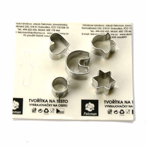 Materiál nerez. Sada obsahuje hvědu, srdce, kolečko, zvon, podkovu. Velikost 13 mm. Český výrobce. Není vhodné do myčky nádobí. EAN 8594034705663