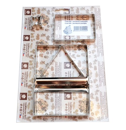 Sada vykrajovaček pro zhotovení dílů perníkové chaloupky. Materiál pocínovaný zdravotně nezávadný plech. Český výrobce. Není vhodné do myčky nádobí. EAN 8594034705090