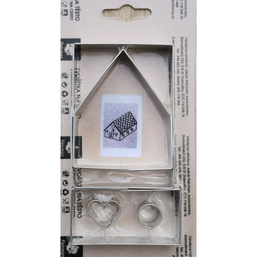 Sada vykrajovaček pro zhotovení dílů perníkové chaloupky. Materiál pocínovaný zdravotně nezávadný plech. Český výrobce. Není vhodné do myčky nádobí. EAN 8594034705526