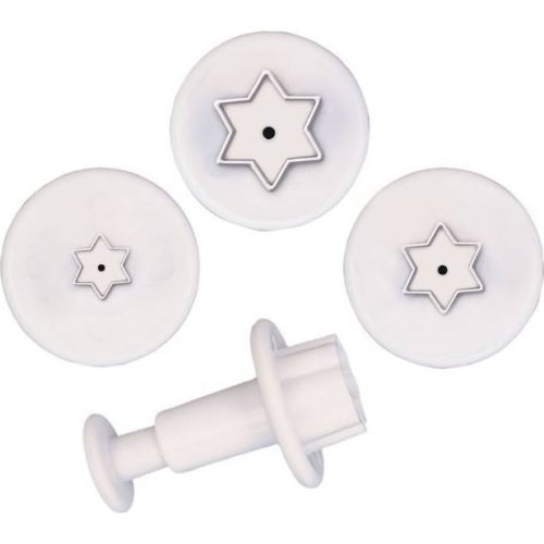 Sada 3 ks plastových vykrajovátek různých rozměrů ve tvaru hvězdy. Součástí sady je plastový píst.