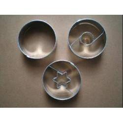 V sadě najdete hladké kolečko, kolečko s kulatým středem a kolečko se středem ve tvaru hvězdičky. Vykrajovátka jsou vyrobena z pocínovaného plechu.