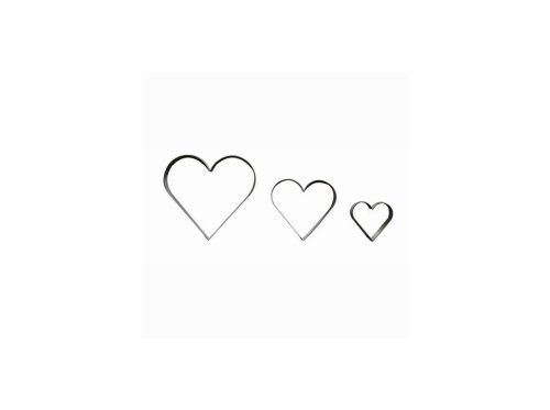 Sada 3 ks vykrajovaček tvar SRDCE různých velikostí. Balení na blistru. Materiál pocínovaný zdravotně nezávadný plech. Rozměry největší 118 a 111 mm, výška pásku 16 mm. Český výrobce. EAN 8594021417296