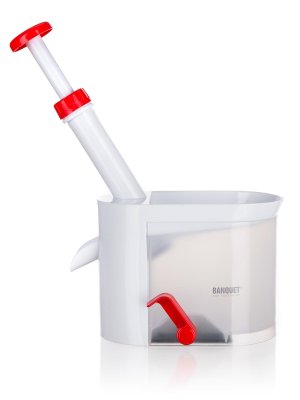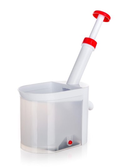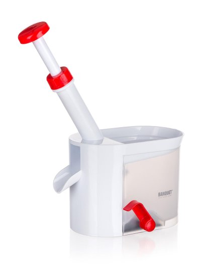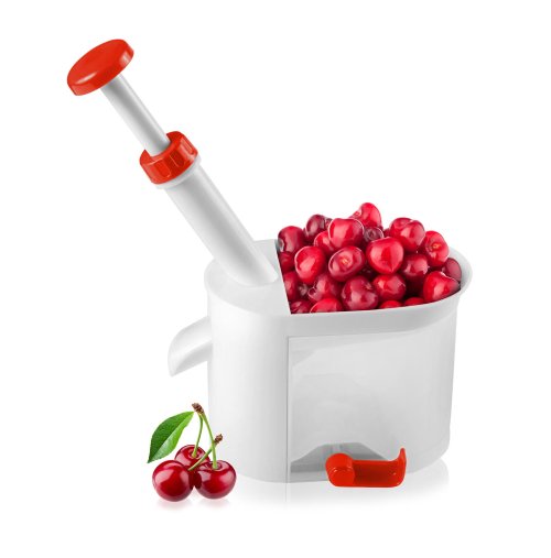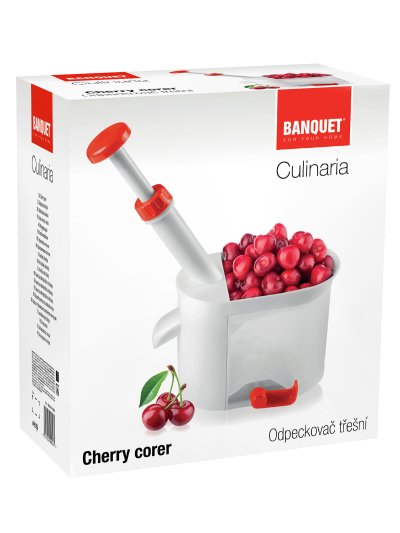 Odpeckovač třešní CULINARIA Red má celkovou výšku 26 cm, rozměr základny 15,5 x 9,5 cm. Výrobek je v bílé barvě s červenými prvky a má gumové přísavky pro zajištění stability při práci.
