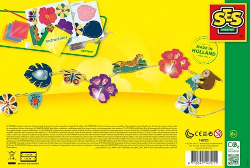 Vyrobte si svou vlastní světelnou girlandu z džungle do své ložnice. Tato sada obsahuje světelnou girlandu s osmi LED světly, pěti barevnými celofánovými listy, lepidlo, štětec, zvířátka z džungle a květiny. Spousta nástrojů k vytvoření dokonalé girlandy. Až půjdete večer spát, tato světelná girlanda z džungle krásně rozzáří váš pokoj. Baterie (2x AA) nejsou součástí balení. Věk: 6+
