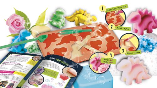 Kreatvní sada na výrobu mýdel. Sada obsahuje : formičky na mýdlo, barevnou esenci, vůni, glycerinové vločky, dřevěnou špachtli a odměrku.