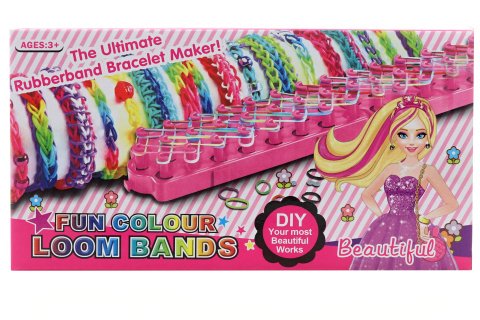 Výroba náramků z gumiček. Balení obsahuje stav a barevné gumičky. Baleno v krabičce. Rozměry balení cca 21x11x3,5 cm. Věk 3+