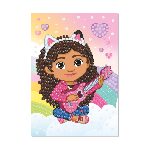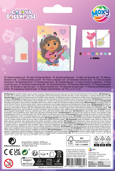 Výroba obrázku s motivem pohádky Gábinin kouzelný domek. Balení obsahuje obrázek o rozměrech 12,5x18 cm, misku, dávkovací pero, lepící pastu a 400 barevných kamínků. Rozměry balení 13,5x19,5x1 cm. Věk 3+
