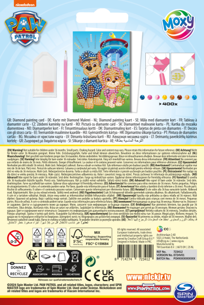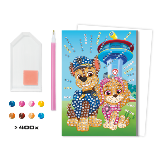 Výroba obrázku s motivem Tlapkové patroly. Balení obsahuje obrázek o rozměrech 12,5x18 cm, misku, dávkovací pero, lepící pastu a 400 barevných kamínků. Rozměry balení 13,5x19,5x1 cm. Věk 3+