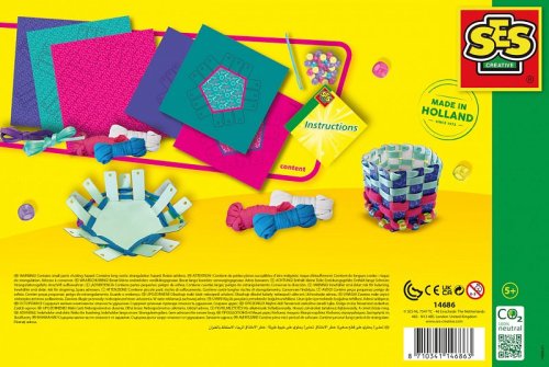 S touto sadou se snadno naučte plést košíky. Použijte papírové košíky jako základ a upleťte ty nejkrásnější košíky pomocí bezpečné plastové jehly a tříbarevné příze. Popusťte uzdu své kreativitě a ozdobte košíky korálky a saténoými stuhami. Praktické pro schování vašich malých pokladů. Sada obsahuje: 6 papírových dílů na košíky, 3 příze z tričkoviny, 2 saténové stuhy, korálky ve 4 barvách, plastová jehla. Věk: 5+