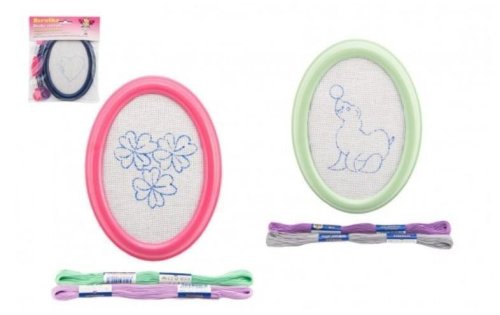 Kreativní set na vyšívání pro všechny šikovné holčičky a malé švadlenky. Sada obsahuje plastový rámeček s napnutým plátýnkem s předtištěným obrázkem, dva další obrázky na vyšití a bavlnky. Sada v několika barevných kombinacích bavlnek a rámu, a v několika motivech obrázku.
