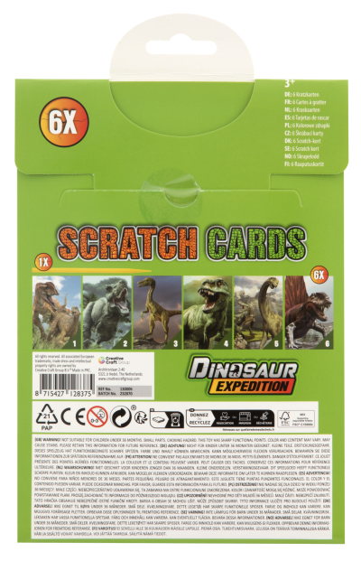 Vyškrabávací obrázky Dinosaurů – balení obsahuje 6 ks vyškrabávacích obrázků různých typů dinosaurů a škrabátko. Velikost obrázku 21×14 cm.