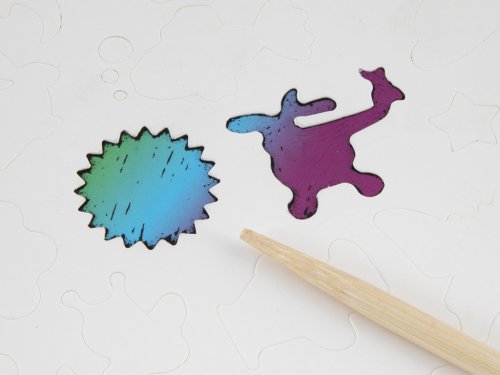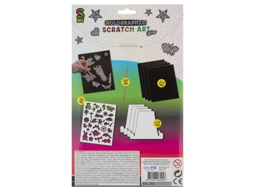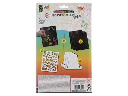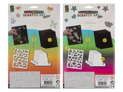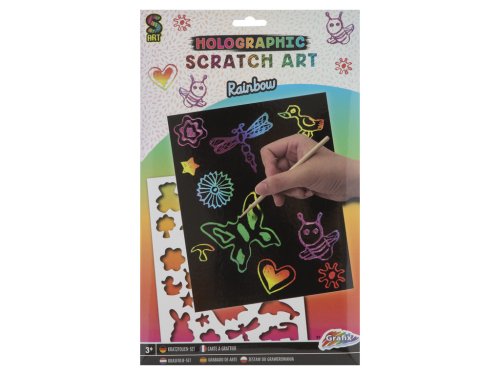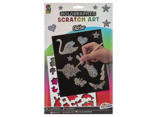 Vyškrabávací obrázky třpytivé a duhové. Sada obsahuje škrabátko, šablony a vyškrabávací podložky.