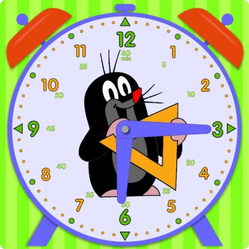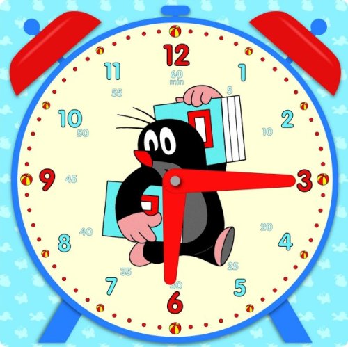 Školní hodiny s motivem Krtka, které slouží k výuce času prvňáčkům základních škol. Velikost 21x21 cm. Vhodné od 3 let.