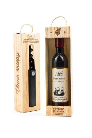 Vývrtka ve tvaru vinné lahve s originálním potiskem viněty je vhodným dárkem pro všechny milovníky vína.