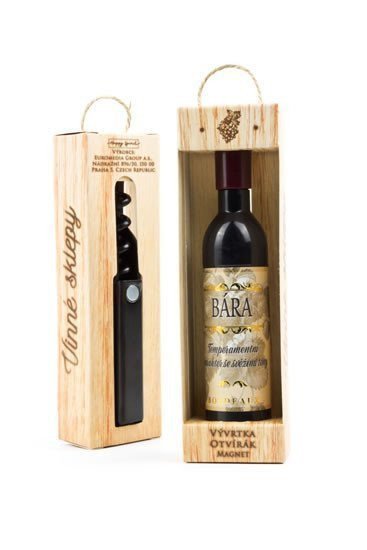 Vývrtka ve tvaru vinné lahve s originálním potiskem viněty je vhodným dárkem pro všechny milovníky vína.