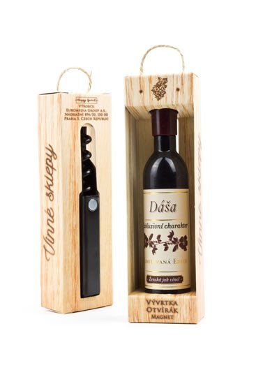 Vývrtka ve tvaru vinné lahve s originálním potiskem viněty je vhodným dárkem pro všechny milovníky vína. Užijte si svoji chvilku v dobré společnosti! Vývrtka s magnetem pro uchycení na lednici je balena v dárkové krabičce. Rozměr 12,5 x 3,5 x 2,5 cm.