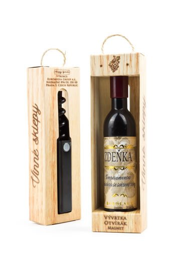 Vývrtka ve tvaru vinné lahve s originálním potiskem viněty je vhodným dárkem pro všechny milovníky vína.