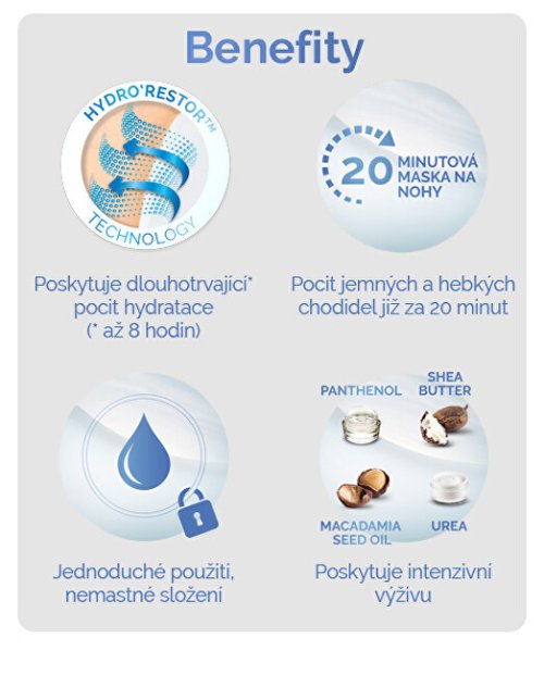 Účinné hydratační a vyživující složení s aktivními ingrediencemi (bambucké máslo, makadamový olej, glycerol, urea). Pro jemné a hladké nohy během jedné aplikace, která je snadna a rychlá.