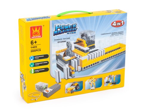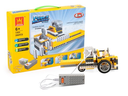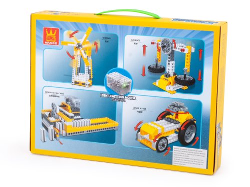 Balení obsahuje: 286 dílků stavebnice Wange, box na 2 x AA baterie (nejsou součástí balení), kabel, elektrický motůrek se světelnou diodou. K vložení baterie do nabíjecího ovladače je třeba malý šroubovák.
