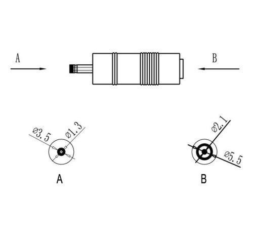 Napájecí redukce z konektoru 2,1 x 5,5 mm (F) na 1,3 x 3,5 mm (M). Maximální zátěžový proud pro redukci je 5,4 A.