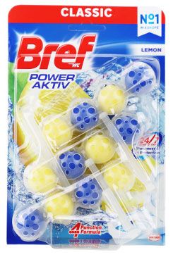 Bref Power Aktiv Lemon je pevný WC blok s vůní citrónu v atraktivním balení. Čtyři kuličky v sobě ukrývají recepturu se čtyřmi funkcemi- 1) dokonalá čistota 2) dokonalá čistící pěna 3) dokonalá ochrana proti vodnímu kameni 4) dokonalá svěžest. Balení obsahuje tři WC bloky - 3 x 50 g. Zavěste Bref Power Aktiv pod okraj WC mísy.