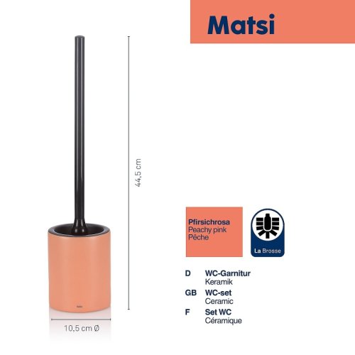 Keramická sada Matsi dodá vaší koupelně jemný akcent v broskvově růžové barvě. Sada je vybavena kartáčem La Brosse v elegantní černé barvě, včetně plastové rukojeti. Tento praktický a stylový doplněk zaručuje dokonalou čistotu vaší toalety.
