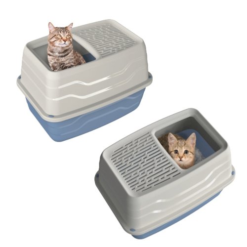 Uzavřené, prostorné wc pro kočky s horním průlezem z kvalitního odolného plastu.