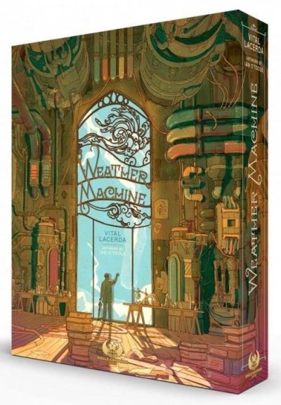 Ve hře Weather Machine se stáváte vědci pracujícími v týmu prof. Lativa, pod jehož vedením již nějaký ten pátek manipulujete s počasím: upravujete srážky dle potřeb zemědělců, udržujete stálý vítr a blankytné nebe, tím zaručíte přísun energie z obnovitelných zdrojů, ale také například posouváte teplotu tak, aby dokonale vyhovovala sportovním utkáním a návštěvníkům turistických resortů. Prototyp stroje na ovládání počasí doposud vždy bezchybně splnil zadání. S každou další aktivací vám ovšem pomalu dochází, že použití stroje je vykoupeno znepokojivým vedlejším účinkem. Pokaždé když s jeho pomocí upravíte počasí, zároveň se změní podmínky někde jinde na planetě – zdá se, že stroj je podřízen „efektu motýlích křídel“. Sen profesora Lativa o konci přírodních katastrof se rychle proměnil v noční můru o konci lidstva. Testujete stroj dál, ale každá další aktivace s sebou přináší stále horší a horší kalamity. Jednoho dne vtrhne profesor rázným krokem do laboratoře, následován skupinkou lidí v oblecích a s kamennými výrazy ve tvářích. Vládní zmocněnci si uvědomili závažnost situace a zároveň pochopili, že jedině tým profesora Lativa může zachránit svět před zkázou, kterou sám zapříčinil. „Musíme postavit nový prototyp,“ oznámí profesor a delegáti jej na něj vrhnou znepokojené pohledy, „…ale tentokrát dokonalý.“ Delegáti mlčky a stroze přikývnou. „Vláda nám poskytne finance a my musíme uspět.“ Profesor Lativ začne vysvětlovat svůj plán a okamžitě je jasné, že bude potřeba zajistit obrovské zásoby robotů a chemikálií. Ale materiály nejsou všechno. Zásadní je také čas: musíte se plně soustředit a nepromarnit jediný okamžik, jinak nebudete mít sebemenší šanci předejít hrůzostrašné globální katastrofě! Musíte upravit zemskou atmosféru dřív, než budou podmínky na Zemi tak nehostinné, že vymře nejen celý druh Homo sapiens, ale také nespočet dalších živočichů ve všech podnebných pásmech. Ať bude výsledek vašeho snažení jakýkoli, profesor Seni Lativ bude už navždy znám jako šílený, byť geniální vědec. Pokud však uspějete a lidstvo přežije, vy a vaši kolegové máte šanci vstoupit do dějin jako spasitelé lidstva a planety. Příběh napsal Nathan Morse. Tato nabídka obsahuje všechny dosažené stretch goals z kampaně. Hra je určena pro 1-4 hráče od 14 let. Pravidla a nápovědové karty jsou v češtině a angličtině. Herní materiál je jazykově nezávislý. V nabídce máme také také doplňky: metal gears add-on pack (sadu 50 kovových součástek stroje), kovový žeton Nobelovy ceny. OBSAH HRY: 1 herní plán, 4 laboratoře, 1 pravidla hry a 4 nápovědy hráčů, 4 figurky vědců, 48 robotů, 4 bodovací žetony, 20 žetonů poukazů, 4 ukazatele iniciativy a 4 ukazatele pořadí hry, 12 žetonů financování, 24 žetonů průlomů, 3 vládní žetony, Lativ, jeho asistent a 5 Lativových robotů, 12 žetonů citací a 5 žetonů zámků, 12 žetonů ocenění a 1 Nobelova cena, 10 žetonů vládního výzkumu, 15 žetonů laboratorního výzkumu, 10 žetonů inovačního výzkumu, 25 chemikálií, 15 destiček extrémního počasí, 15 destiček experimentů, 30 destiček dílen, 15 destiček dotací a 12 destiček investic, 36 destiček cílů, 50 součástek stroje + Kickstarter Upgrade Pack. Poznámka o vydání: Jde o anglickou verzi s plnohodnoutnou češtinou navíc. Krabice je původní anglická. Na dně krabice je pod folií list v češtině. Hra obsahuje anglická a česká pravidla a české a anglické karty nápověd.