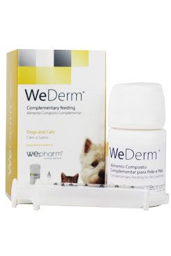 Výživový doplněk pro psy a kočky s vysokým obsahem esenciálních mastných kyselin, vitamínů a minerálů určených k podpoře kožní funkce v případech dermatózy, svědění, vypadávání chlupů nebo jakéhokoliv jiného dermatologického projevu alergie. WeDerm ®