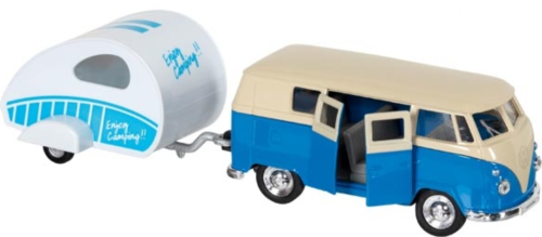 Klasický a ikonický autobus značky Volkswagen s karavanem. rozměry autobusu: cca 10,5 x 4 cm rozměry karavanu: cca 7,5 x 4 cm dveře u autobusu lze otevřít