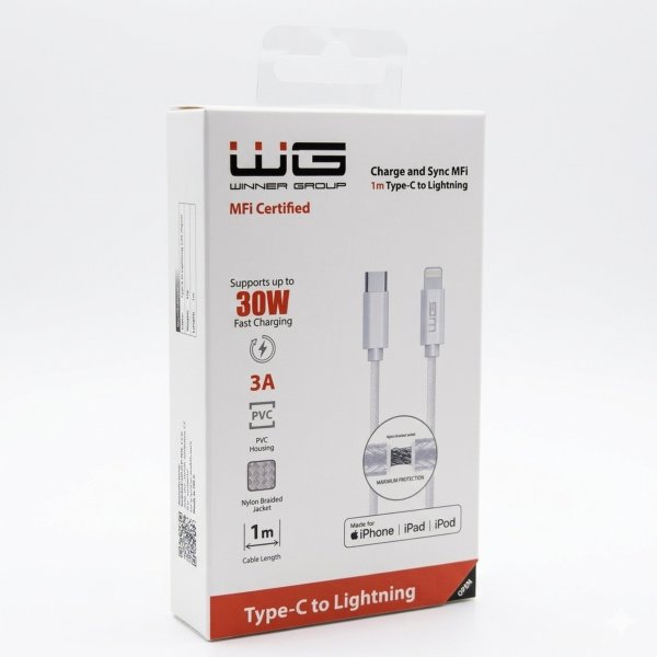 Prémiový WG Datový kabel s certifikací MFi (Made for iPhone/iPad/iPod) umožňuje souběžný přenos dat a rychlé dobíjení baterie zařízení se slotem Lightning.