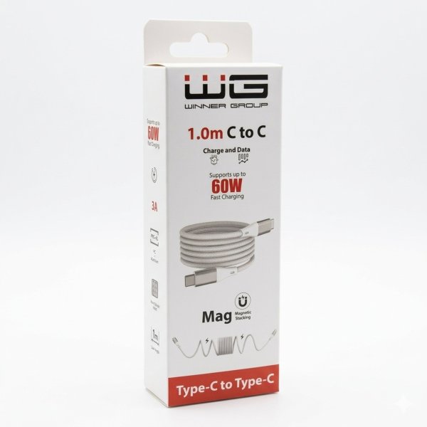 Kvalitní 3ampérový nabíjecí a synchronizační kabel WG s nylonovým opletem bílé barvy. Konektory Type-C/Type-C.