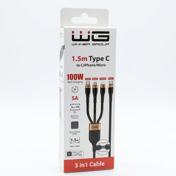 WG Datový kabel Type-C_Type-C/Lightning/micro se hodí do každé domácnosti. Díky tomuto výrobku vám stačí jeden kabel k nabíjení tří různých typů zařízení – moderních Type-C, Apple zařízení s Lightning slotem a starších zařízení s micro-USB. Kombinace z Type-C na Type-C umožňuje nabíjení až s výkonem 100 W. Zařízení se slotem Lightning umožňuje kabel nabíjet až 18W výkonem a starší zařízení s micro-USB slotem 10W výkonem.