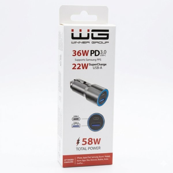 WG nabíječka v luxusním hliníkovém provedení do 12/24V zásuvky vašeho vozu se dvěma sloty, které oba umožňují rychlonabíjení (QC 3.0 a PD).