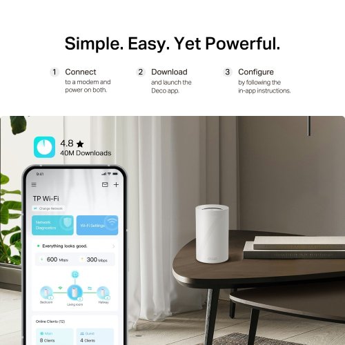 Moderní Wi-Fi 7 zaručuje stabilní provoz i při extrémně hustém provozu. Deco BE68 zvládne připojit až 200 zařízení, pokryje plochu až 750 m2 a eliminuje mrtvé zóny. Technologie AI Mesh zajistí plynulý přechod mezi jednotkami bez přerušení. Systém lze provozovat v režimu router nebo access point.