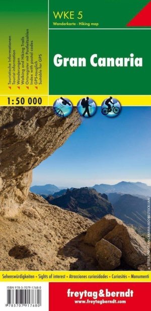 Turistická mapa "Gran Canaria 1:50 000" je pravidelně revidována a obsahuje aktualizované informace o turistických trasách, chatách, přírodních památkách, kulturních památkách a zařízeních pro volný čas. Je kompatibilní s GPS. Přiložená informační brožurka nabízí výběr nejlepších turistických tras a památek na ostrově, mapy měst Gáldar, Las Palmas de Gran Canaria, Playa del Inglés a rejstřík míst s PSČ (jazyky: němčina, angličtina, španělština). Turistické informace o historii a regionech ostrova, informace pro volný čas, turistické a dálkové turistické stezky, oboustranné; Oblast: Gran Canaria, Kanárské ostrovy, Španělsko; Díky podrobné digitální kartografii a přesným měřítkům jsou turistické mapy freytag & berndt ideálními společníky pro pěší turistiku, horolezectví a lyžařské túry.