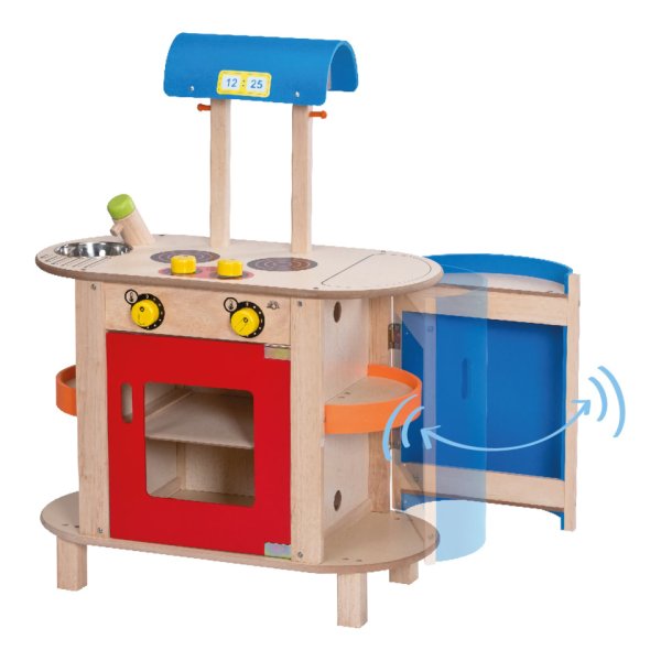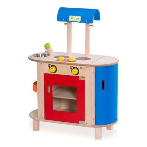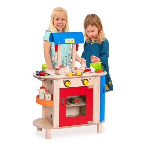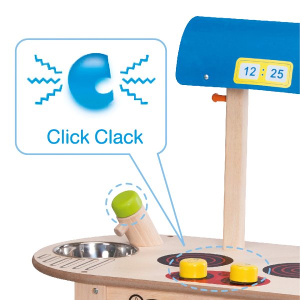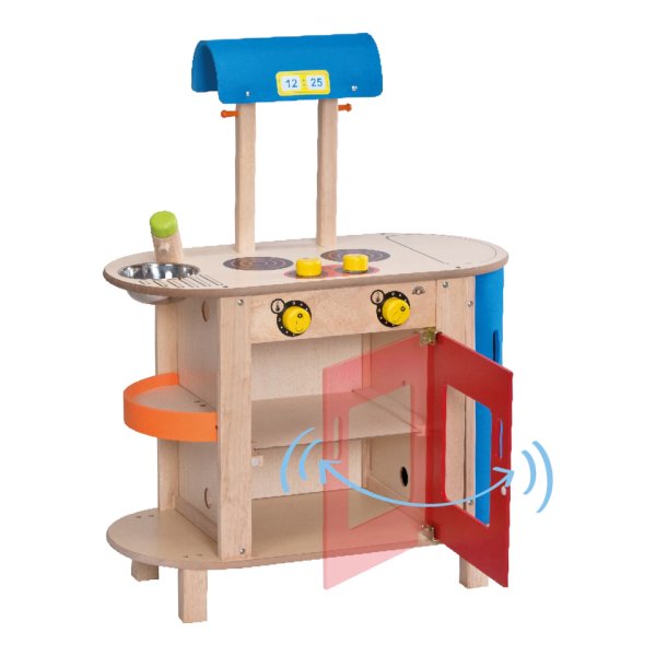 Moderně vyhlížející kuchyňka, která nabízí hodiny zábavy. Nabízí sporák s vestavěnou troubou a dvouplotnovou varnou deskou. K těm jsou přidruženy ovladače, jejichž otáčení provází cvakavé zvuky dodávající hrám na uvěřitelnosti. Kuchyňka má dále vestavěnou lednici, dřez s baterií rovněž poskytující zvukovou odezvu, digestoř a na boku poličky. Na poličkách a uvnitř spotřebičů, za dvířky s magnetickým zavíráním, nabízí praktické úložné prostory. Pod digestoří je také vybavena dvojicí háčků pro kuchyňské náčiní. Výrobek vyžaduje montáž, dodáváno s obrázkovým návodem k sestavení. Hlavní vlastnosti:multifunkční sporák, dřez, lednice a digestořdvířka s magnetickým zavíránímzvukové efekty ovládání spotřebičůúložné prostory