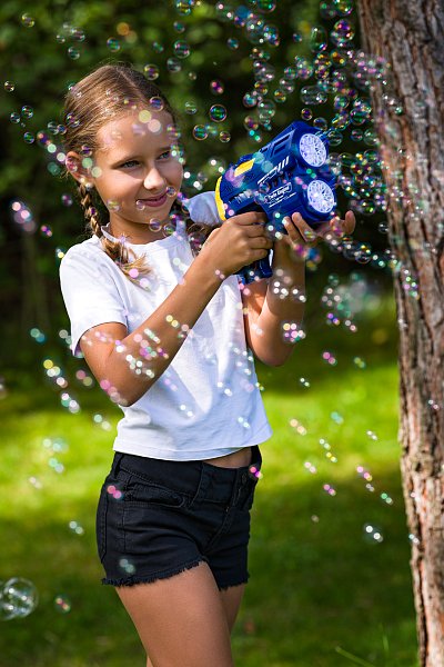 Blaster nové generace s 20 bublinkovými otvory a světelnými efekty. Po zapnutí se rozsvítí a vytváří proud jemných bublinek. Díky integrovanému zásobníku zajistí dlouhotrvající a vizuálně působivou zábavu. 20 otvorů pro intenzivní produkci bublinek. LED světelné efekty. Vestavěný zásobník na 105 ml bublinkového roztoku. Napájení: Lithiová baterie součástí, nabíjení USB kabelem. Assort je náhodný mix modelů. Výběr nelze ovlivnit. V kolekci dvě barevné varianty. Baleno v open boxu. Rozměry produktu: 17 x 20 x 7 cm. Rozměry balení: 22,5 x 22 x 7,5 cm. Věk: 3+