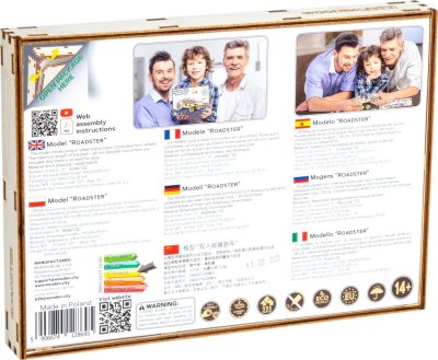 Sportovní vůz Roadster je vytvořen pro extrémně sebevědomé osoby. Roadster má dvojité sedadlo pro pohledného závodníka a jeho krásnou přítelkyni. Setrvačníkový mechanismus, vratná kola, přední otočná kola, pogumovaná kola a dokonalý design. Stačí projet cílovou páskou a budeš opravdovým závodníkem. Model má několik detailů skutečného automobilu: - poznávací značku, - přední otočná kola, - setvačníkový mechanismus, - vratná kola, - detailní motor, - dvojité sedadlo. 3D puzzle WOODEN CITY Roadster je skvělým dárkem pro každého milovníka sportovních vozů. Obtížnost: 3 z 5 (dle rozdělení Wooden City) Orientační doba na složení: 2 hodiny Měřítko: 1:32 Dřevěné 3D puzzle WOODEN CITY jsou detailně propracované funkční mechanické modely, které se skládají bez lepidla nebo nářadí. Jsou vyrobeny z ekologických dřevěných materiálů - kvalitní březové překližky. S mechanickými dřevěnými puzzle WOODEN CITY zažijete hodiny zábavy při skládání a poznáte převody, gumičkové motory, ozubená kolečka a další součástky z bezprostřední blízkosti.