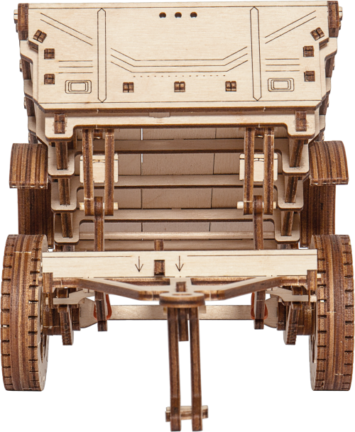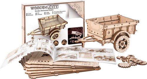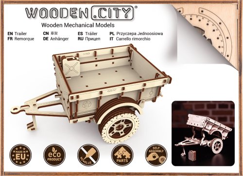 Vlastnosti přívěsu: - hák pro připojení, - stejně velká kola 4x4 jako na džípu, - zvedací nástavba (typ sklápěče), - sklopné zadní dveře, - odnímatelný kanystr , - spouštěcí páku, - vhodné pro přepravu ulovené zvěře nebo zajatců. 3D puzzle WOODEN CITY Trailer je skvělým a nezbytným doplňkem vaší 3D sbírky dřevěných modelů. Obtížnost: 3 z 5 (dle rozdělení Wooden City) Orientační doba na složení: 3 hodiny Měřítko: 1:12 Dřevěné 3D puzzle WOODEN CITY jsou detailně propracované funkční mechanické modely, které se skládají bez lepidla nebo nářadí. Jsou vyrobeny z ekologických dřevěných materiálů - kvalitní březové překližky. S mechanickými dřevěnými puzzle WOODEN CITY zažijete hodiny zábavy při skládání a poznáte převody, gumičkové motory, ozubená kolečka a další součástky z bezprostřední blízkosti.