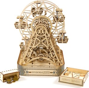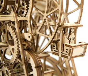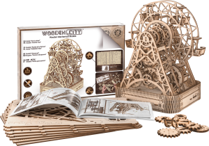 Náš dřevěný model Wooden City - FERRIS WHEEL vám umožní postavit si vlastní oblíbenou atrakci. Samotné kolo, jeho kabiny, cestující, jsou otevřeným mechanismem, který předvádí pohyb všech jeho částí, a má překvapení - skrytou schránku. Právě jsi vstoupil do skutečného zábavního parku! Před více než 120 lety se nápad vytvořit vysoké kolo, které by vynášelo vyhlídkové kabiny do velké výšky, zdál nemožný. Tehdy však mladý inženýr následoval své sny a George Washington Gale Ferris postavil první kolo, které bylo navrženo pro přepravu 2 160 cestujících. Dnes tento vynález nese jeho jméno - FERRIS WHEEL. Dřevěná mechanická stavebnice vyhlídkového kola s jedinečným designem a překvapivými detaily modelu je stvořená pro příjemné chvíle plné zábavy a skvělých emocí.