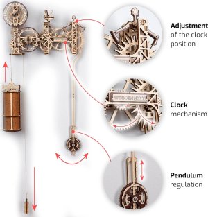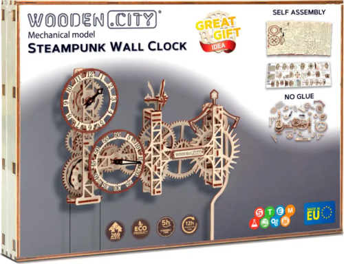 3D puzzle sada pro vytvoření úchvatných funkčních steampunkových hodin s kyvadlem, které se budou krásně vyjímat na zdi. Sestavte všechny díly a mechanismy dohromady a sledujte, jak fungují. A až budete hotovi, věda a umění splynou v jedinečné dekorační dílo. Nástěnné hodiny WOODEN CITY Steampunk jsou neobvyklým dárkem pro milovníky krásy a překvapení.