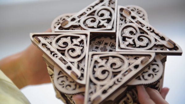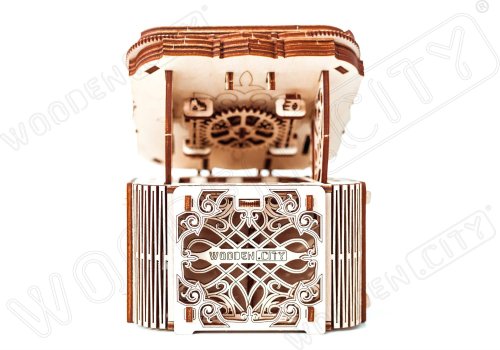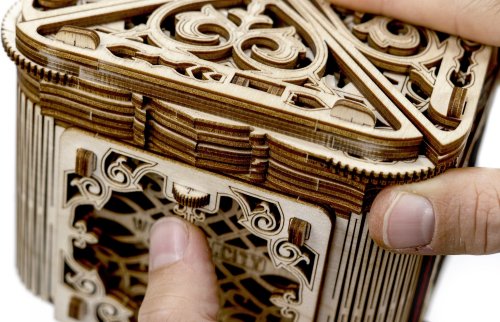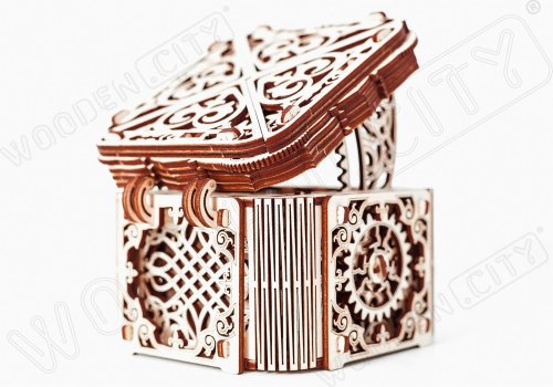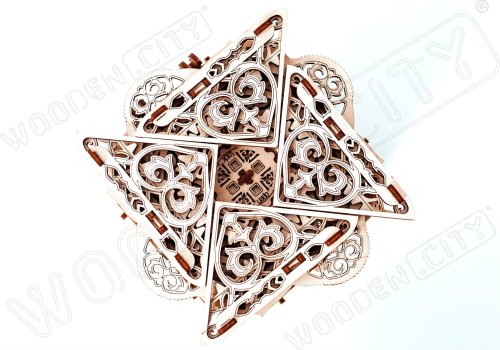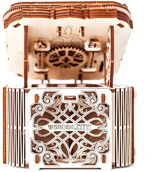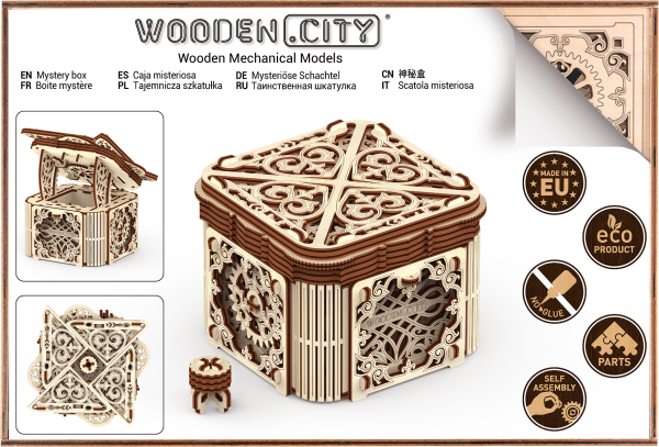 Model je zhmotněním uměleckého řemesla: - víko se otevírá klíčem, který spojuje 4 trojúhelníky, - čtyři živly: mysl, tělo, zrak a sluch, - pátým je láska, která otevře všechny zámky. 3D puzzle WOODEN CITY Mystery Box je neobvyklým dárkem pro milovníky krásy a překvapení.