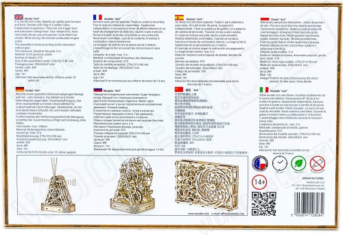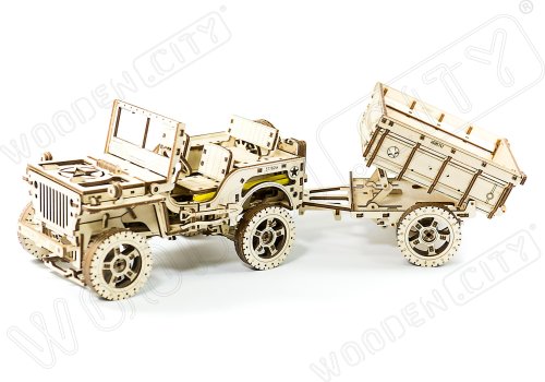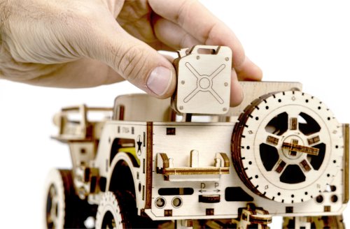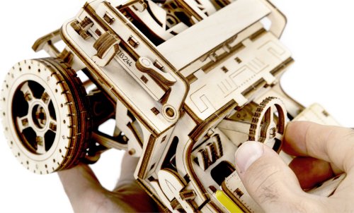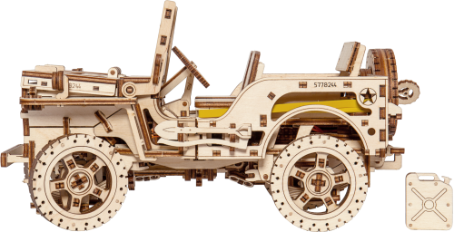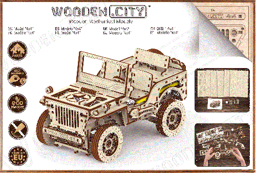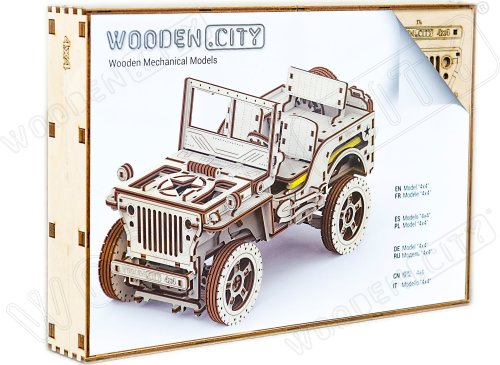 Po sestavení nastavte polohu páky na jízdu vpřed nebo vzad, dejte zamykací páku do polohy stop, natočte model klíčkem (klíč najdete v rezervním kole) a poté spusťte zamykací páku. Džíp má řízení předních kol. Kapota se otevírá a zavírá a je zajištěna dvěma sponami a čelní sklo se vyklápí. 3D puzzle WOODEN CITY Model 4x4 je neobvyklým dárkem pro vaše blízké a milovníky silných vozů. Obtížnost: 5 z 5 (dle rozdělení Wooden City) Orientační doba na složení: 12 hodin Měřítko: 1:12 Dřevěné 3D puzzle WOODEN CITY jsou detailně propracované funkční mechanické modely, které se skládají bez lepidla nebo nářadí. Jsou vyrobeny z ekologických dřevěných materiálů - kvalitní březové překližky. S mechanickými dřevěnými puzzle WOODEN CITY zažijete hodiny zábavy při skládání a poznáte převody, gumičkové motory, ozubená kolečka a další součástky z bezprostřední blízkosti.